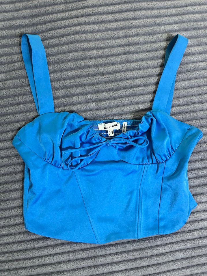 Mavi renkli, koton askılı bustiyer. Yaka kısmında büzgü detayı var son fotoğraftaki kısımda içinden geçen telle korse gibi duruyor. Birkaç kez giydim kilo verdiğim için büyük geliyor. S beden bence S ve M beden uyumlu.