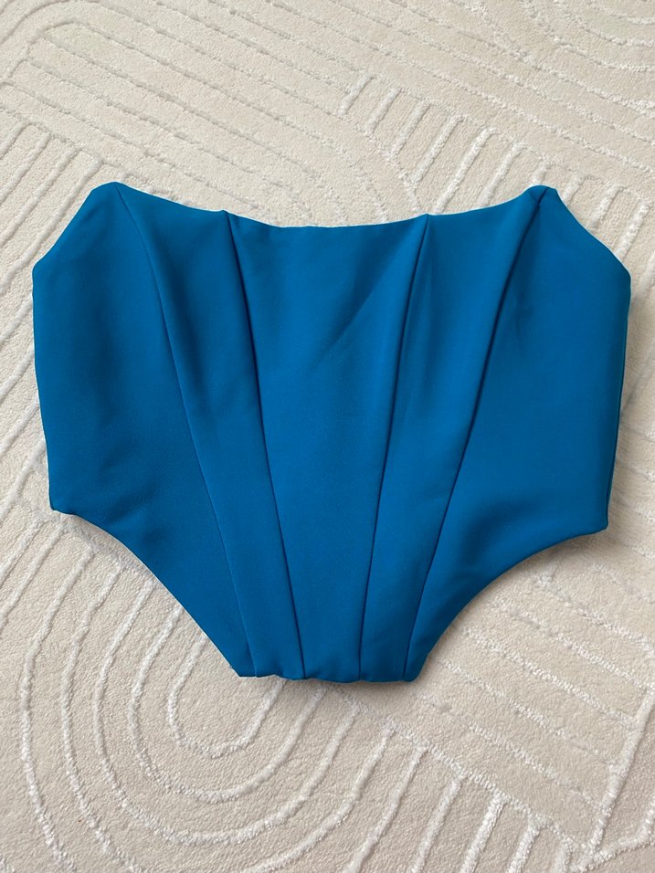 Mavi renkli, pileli ve strapsız tasarıma sahip, vücuda oturan sentetik kumaştan yapılmış çağdaş ve avangart korse büstiyer. Günlük kullanıma uygun.