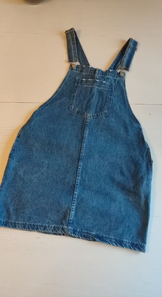 Mavi kot kumaştan, askılı ve tokalı midi elbise. Yüksek yakalı, bol kesim ve ön cepli, günlük rahat sokak stili için uygundur.