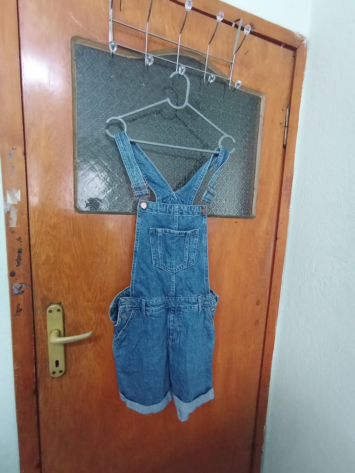 Mavi kot kumaştan, askılı ve tokalı, salaş kesim midi tulum. Günlük sokak stili için uygun, bağlama deseniyle casual görünüme sahip.