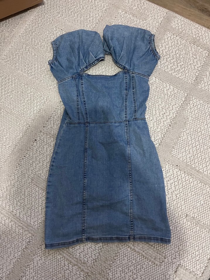Mavi kot kumaştan, bant detaylı, straplez yaka ve kısa balon kollu midi uzunlukta, vücuda oturan günlük elbise.