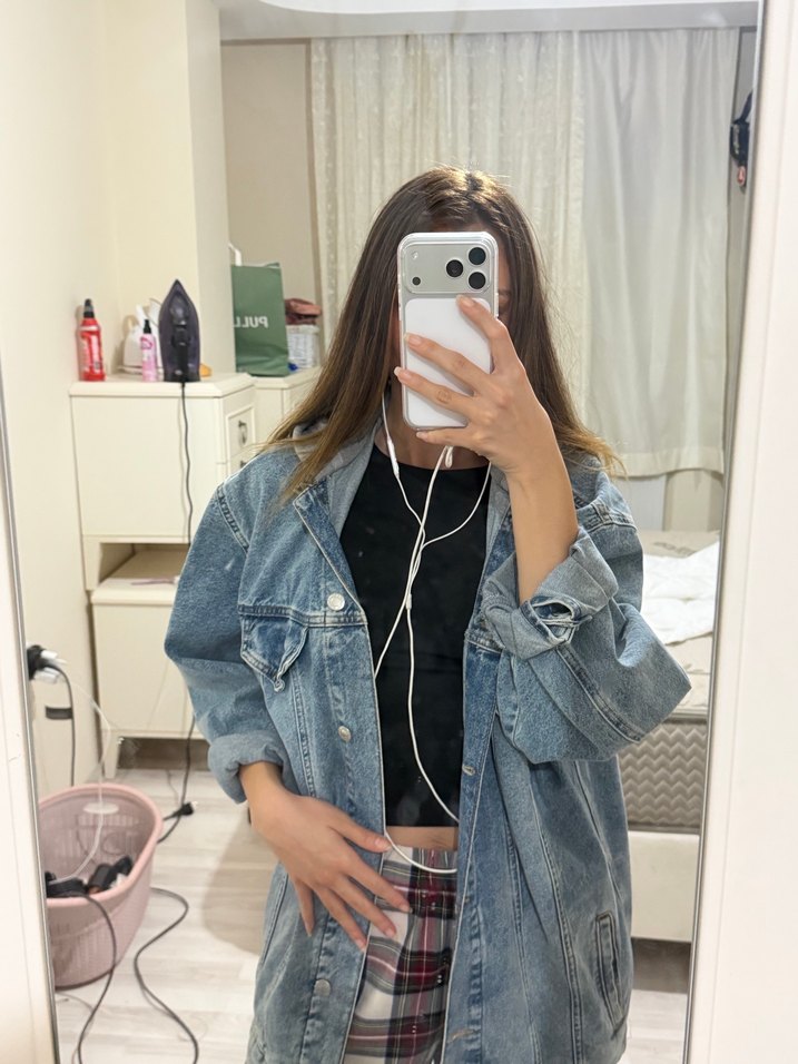 Mavi batik desenli denim ceketin salaş kesimi ve uzun kolları vardır. Yüksek yakasıyla trend sokak stilini yansıtır. Rahat ve şık günlük kullanım için uygundur.