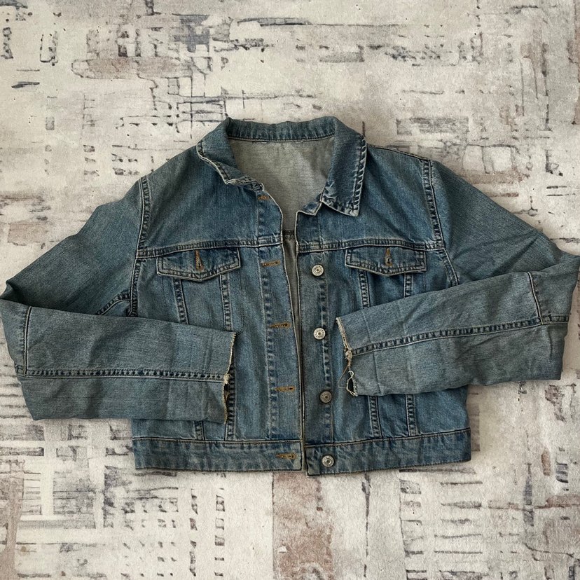 Düğmeli, mavi kot ceket, notalı yaka ve uzun kollu. Bol kesim, gündelik kullanıma uygun
