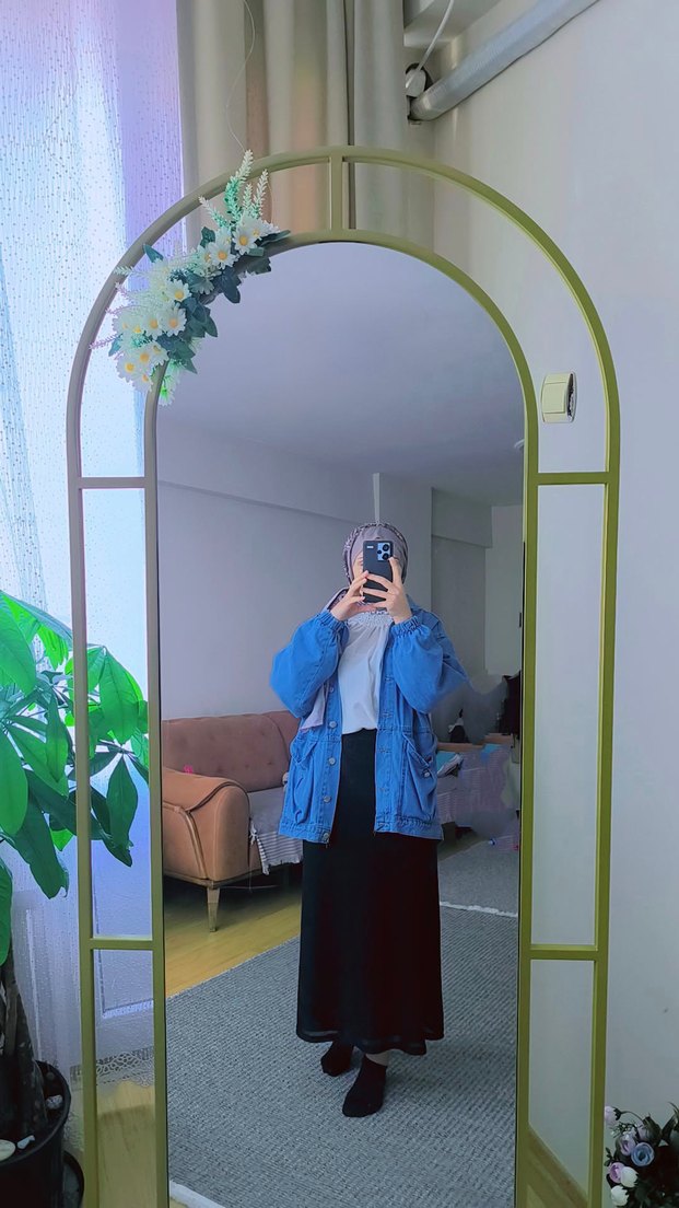 Uzun kollu, yüksek yakalı, bol kesim kadın ceket. Pastel mavi denim malzemeden, transparan tie-dye desenli, sade ve mütevazı tasarım. Günlük kullanıma uygun. ️