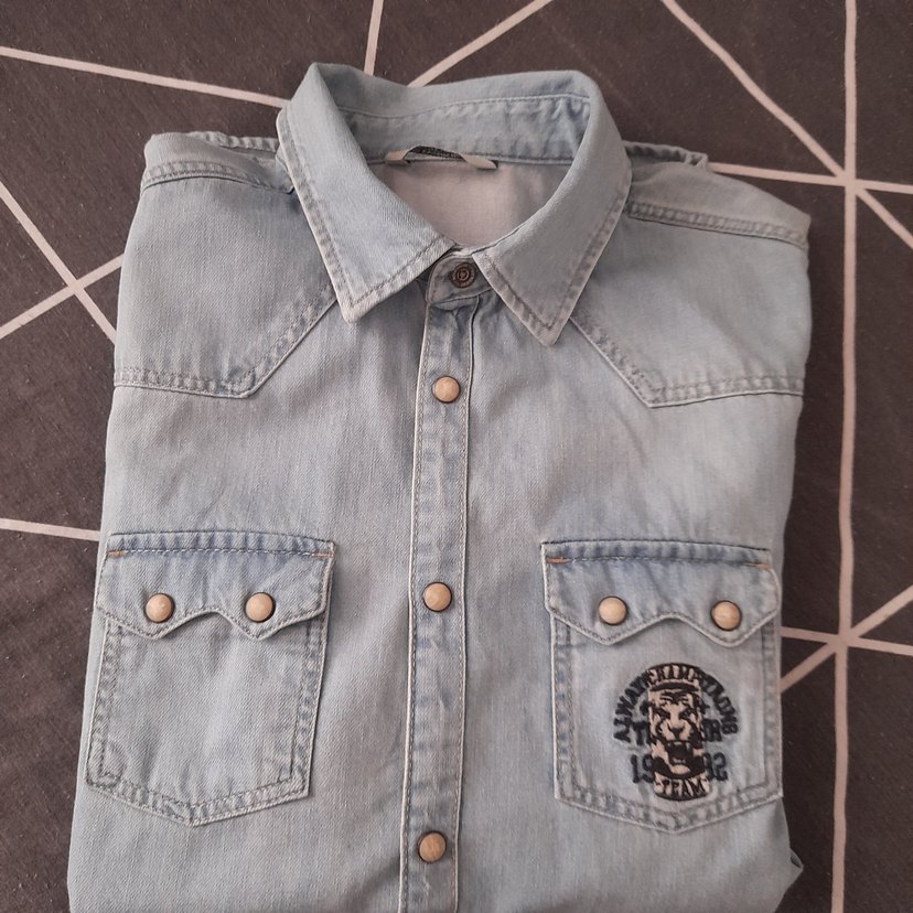 Bu erkek denim gömlek, düğmeli önü,kolları toplamalı düğmeli kot kumaşı. göğüste çep detayı 2 kes giyildi kaliteli ve tarz ürün