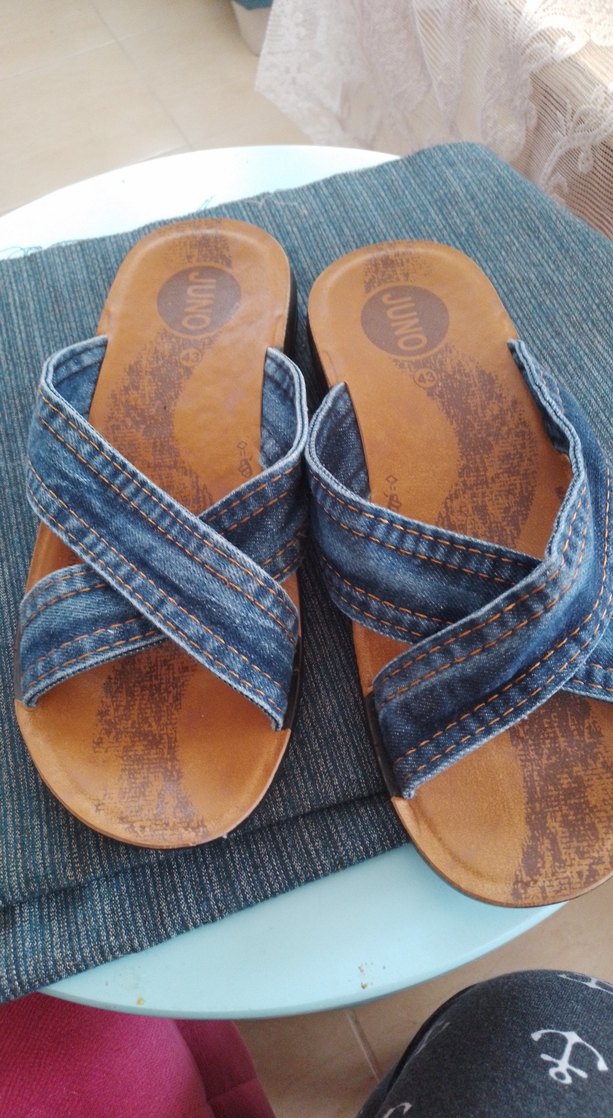 Kot kumaştan yapılmış, erkek sandaletler. Çapraz bantlı ve kahverengi tabanlı, günlük rahat kullanıma uygun.