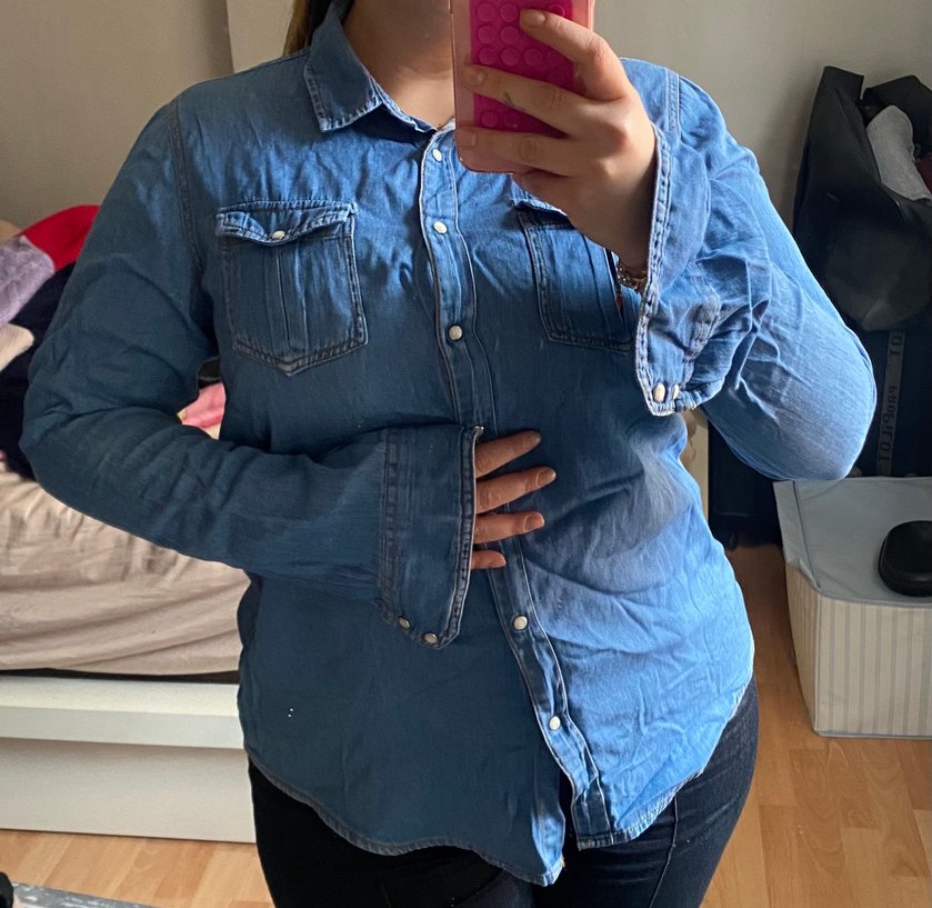 Kadınlar için fitted kesim, kot kumaştan yapılmış, yakalı ve düğmeli mavi gömlek. Uzun kollu ve midi boyda, günlük sokak tarzına uygun.
