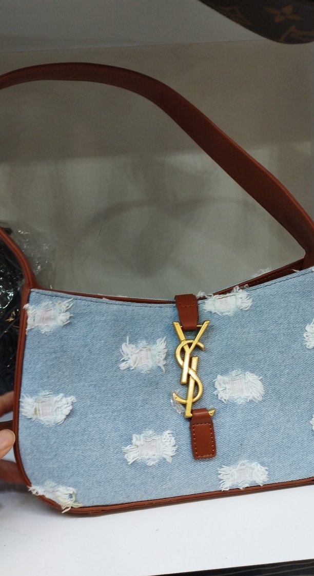 Mavi kot kumaştan, tokalı detaylı ve yıpranmış desenli kadın omuz çantası, trend sokak stili için uygun. ✨