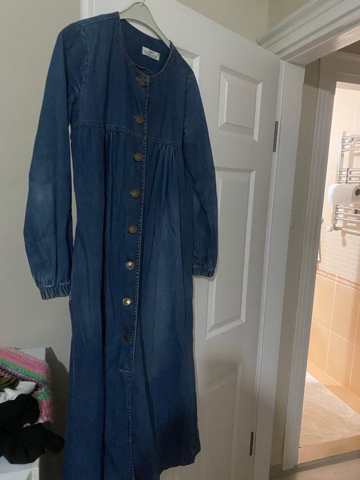 Lacivert uzun boylu, düğmeli, bol kesim Uzun kollu ve yakası notched lapel, günlük rahat kullanıma uygun. Kot uzun kap