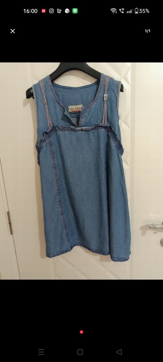 Kolsuz, V yaka, kemerli ve bol kesimli mavi kot tunik. Günlük rahat sokak stili için uygundur.