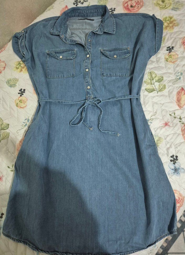 Mavi tonlarında, kısa kollu, yakalı, kemerli bol kesim mini kot elbise. Günlük kullanım için uygundur.