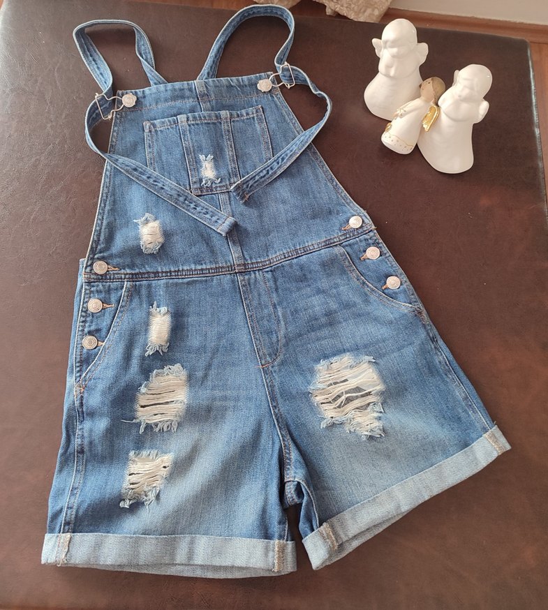 Mavi kot kısa askılı salopet , bol kesim ve tokalı askılarla. Yırtık detaylı ve yan düğmeli, gündelik sokak stili için uygun.Colins çiçek desenli straplez penye elbise hediye olarak gönderilecektir.İkili ürün çok uygun fiyatlandı. sondur fiyat.