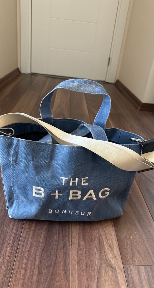 Mavi kot kumaş, tokalı askılı ve 'THE B+ BAG BONHEUR' baskılı kadın omuz çantası. Gri ayarlanabilir askısı ile kullanışlıdır. Günlük kullanıma uygundur. Çok temiz kullandı taşlanmış rengi favori sezon rengidir