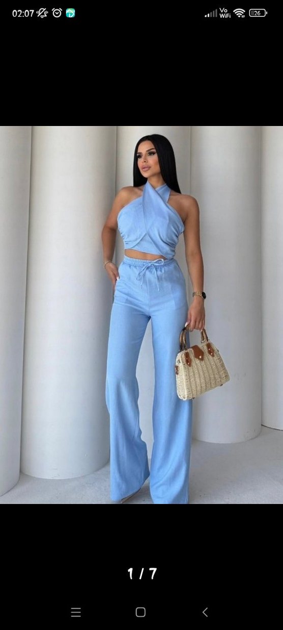 Mavi keten kumaşından, askılı ve straplez yaka detaylı, belden kemerli kadın ikili takım m bedendir . Regular kesim, uzun boy ve günlük rahat kullanıma uygun.