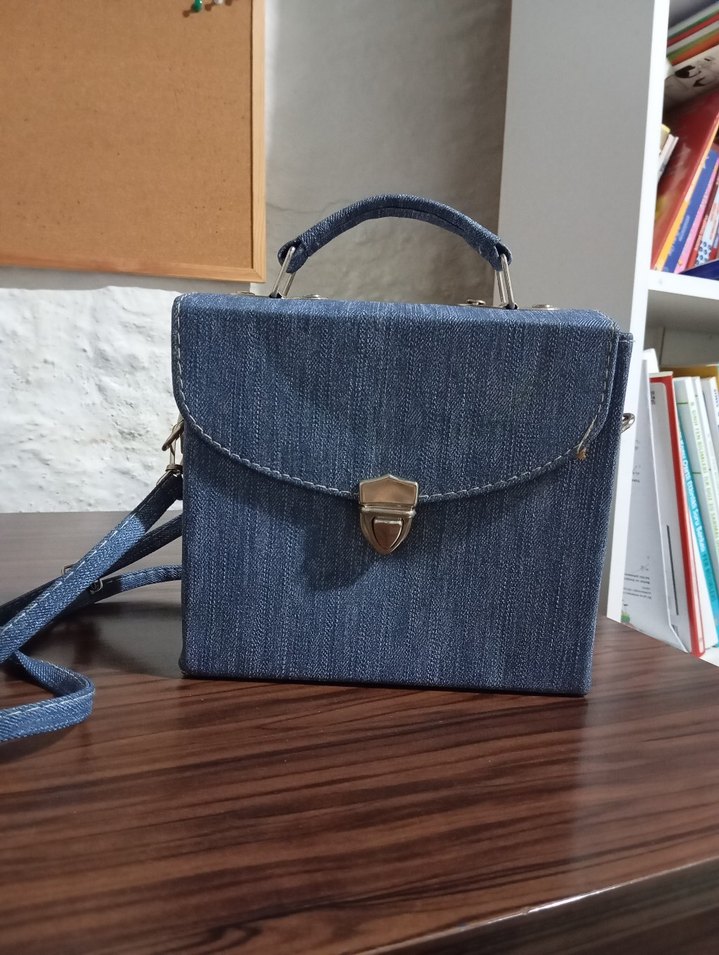 Mavi kot kumaşlı, tokalı kapaklı ve elde taşınabilen sapı olan vintage bohem tarzda kadın çanta. Ayarlanabilir omuz askısı da bulunur. Günlük kullanıma uygundur.