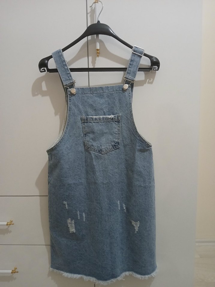 Askılı, mavi kot midi elbise, bol kesim ve tokalı askılarla, ön cep ve hafif yıpratma detayları içerir. Günlük sokak tarzı için uygundur. sadece 1 defa giydim