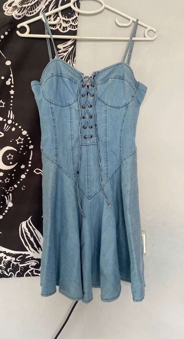 İnce askılı, bağcıklı ön detaylı, kemerli mavi kot midi elbise. Bohem tarzda, vücuda oturan kesimle günlük kullanım için uygun. Bi iki kere giydim m beden