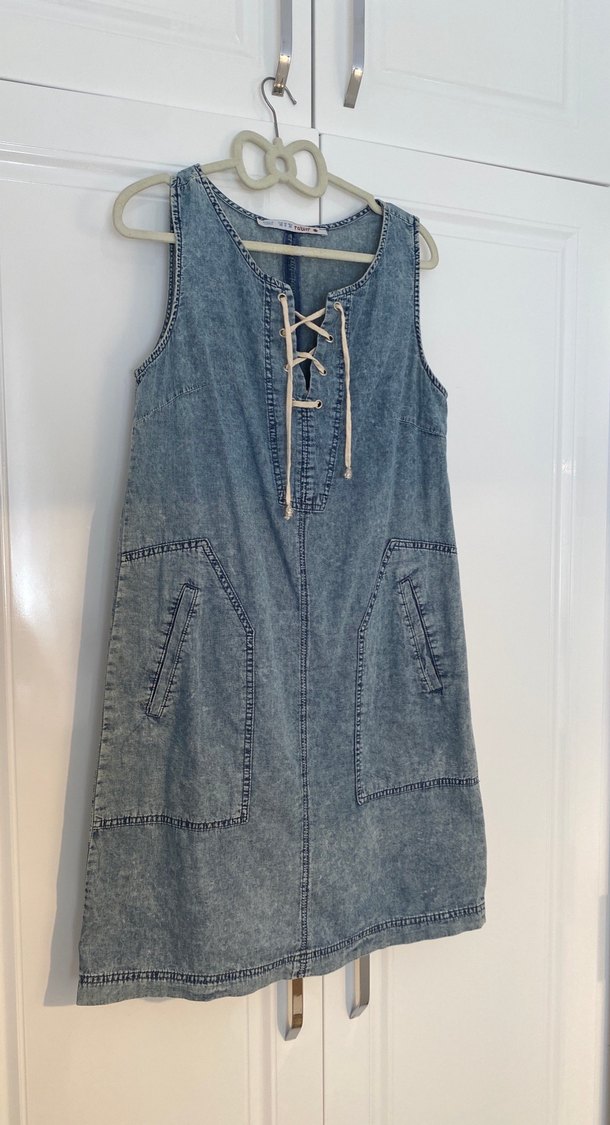 Mavi kot midi boy elbise, askılı ve bohem tarzda. Ön kısmında bağcıklı detay ve fermuarlı cepler bulunur, rahat kesimlidir.