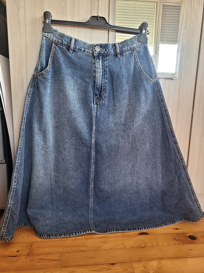 Mavi kot midi etek, bol kesim ve parlak yüzeyle günlük kullanıma uygun, zahmetsiz şıklık sunar. Normcore tarzında, ön cepler ve düğmeli kapama bulunur. Arka bel kısmında lastik vardır bir beden büyük olanlar da rahatlıkla giyebilir Boy : 75 cm