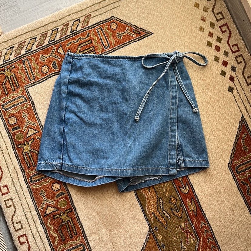 Mavi kot mini şort etek, bol kesim ve kemerli bel detayına sahip. Günlük kullanıma uygun bohem tarzda. 1 kere giyildi onun dışında hiç kullanılmadı.