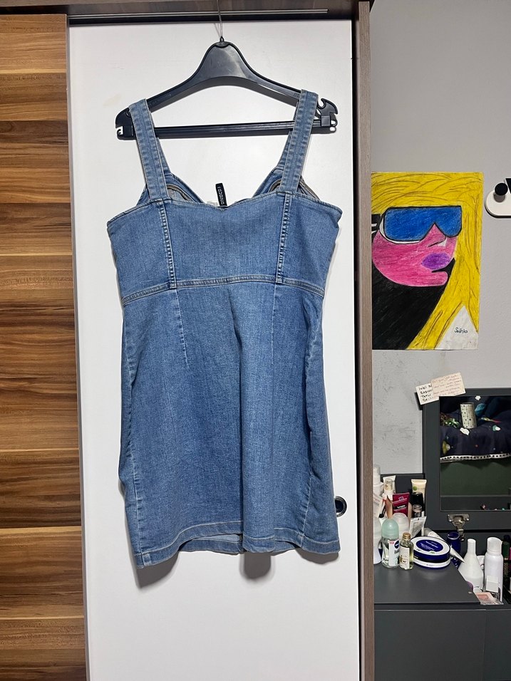 Kemerli, askılı, mavi kot kumaştan, kısa ve vücuda oturan mini tulum. Rahat ve şık günlük kullanım için uygun.