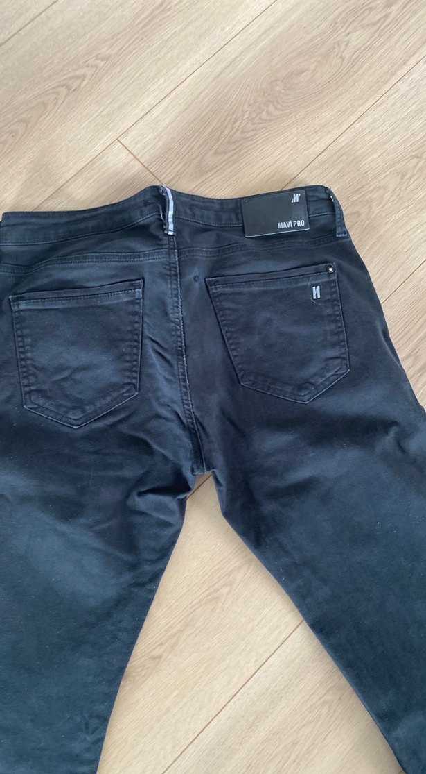 Düğmeli, siyah kot pantolon, normal boyda ve günlük kullanıma uygun sade tasarımlı.