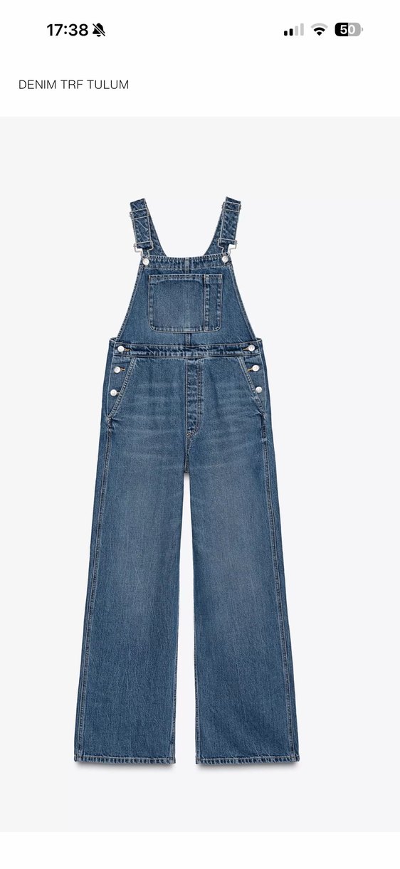 mavi kot salopet, regular fit ve ayarlanabilir tokalı askılarla. Ön cep ve yan düğme detayları bulunur.