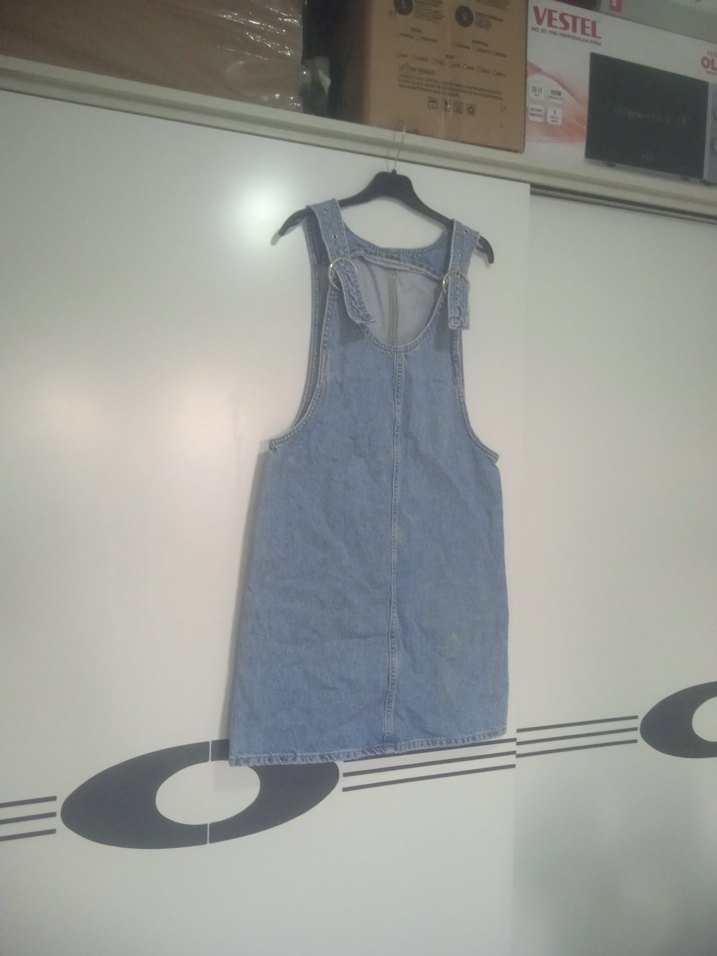 Mavi kot kumaştan, askılı ve bol kesim tulumu. Tokalı detaylarıyla sokak stiline uygun, desensiz model. ölçü alırım