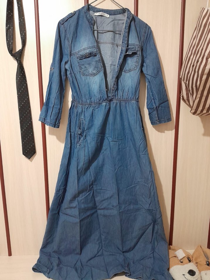 Mavi kot kumaştan, bol kesim, kemerli, V yaka ve askılı kollu uzun bohem elbise. Parlak dokusu günlük kullanıma uygundur.