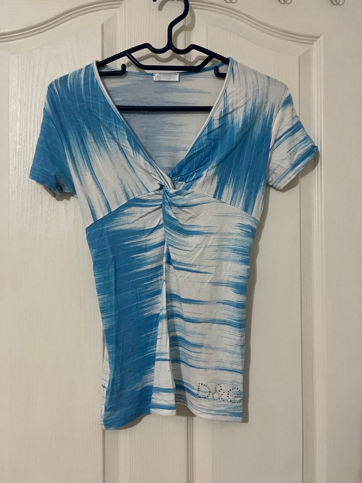 V yakalı, kısa kollu, mavi ve gri kravat boyalı desenli, pileli detaylı, sentetik kumaştan yapılmış, dar kesim kadın tişörtü. Atta hafif leke var