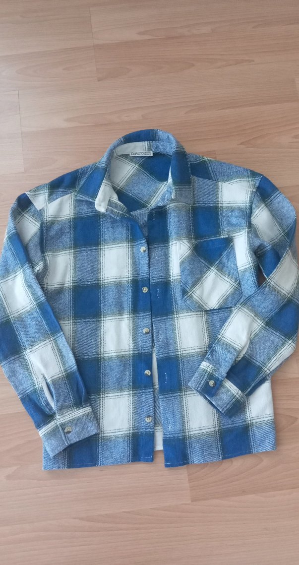Tertemiz sorunsuz.Pamuklu, Mavi ve Krem ekose desenli, düğmeli ve kesik yaka detaylı, bol kesim uzun kollu Pamuklu kışlık gömlek. Önü açıkta kullanılabilir.dolabimda benzeri var birleştirip daha uyguna alabilirsiniz