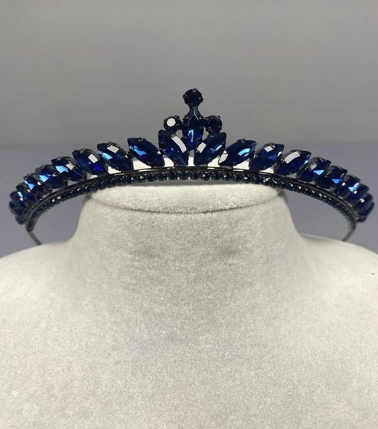 Koyu mavi cam kristallerle süslenmiş, klasik zarafet taç