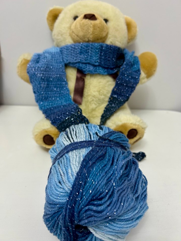 Yumuşak iplikten yapılmış, mavi tonlarında parlak detaylı bohem tarzı örgü atkı. Kıyafetlere renk ve ışıltı katar. Papatya Batik Glitter ile örüldü. İp yapısı %97 akrilik, %3 polyester. Elemeği, özenle örüldü. Eni 10 cm boyu 120-125 cm. Son zamanların en modern ve en popüler atkılarından. İp mavi ebruli ve simli.