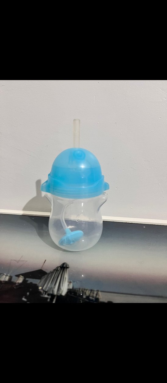 Mavi kapaklı, şeffaf gövdeli ve pipetli renkli bebek biberonu. sıfır ürün kullanılmadı sadece kapak kilidi ve kulp yok