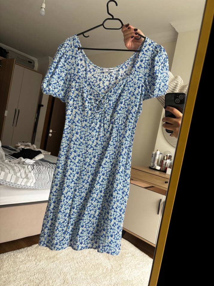 Pamuklu, yumuşak kumaştan, mavi çiçek desenli, V yakalı,önünde küçük büzgülü kısa kollu, mini elbise.