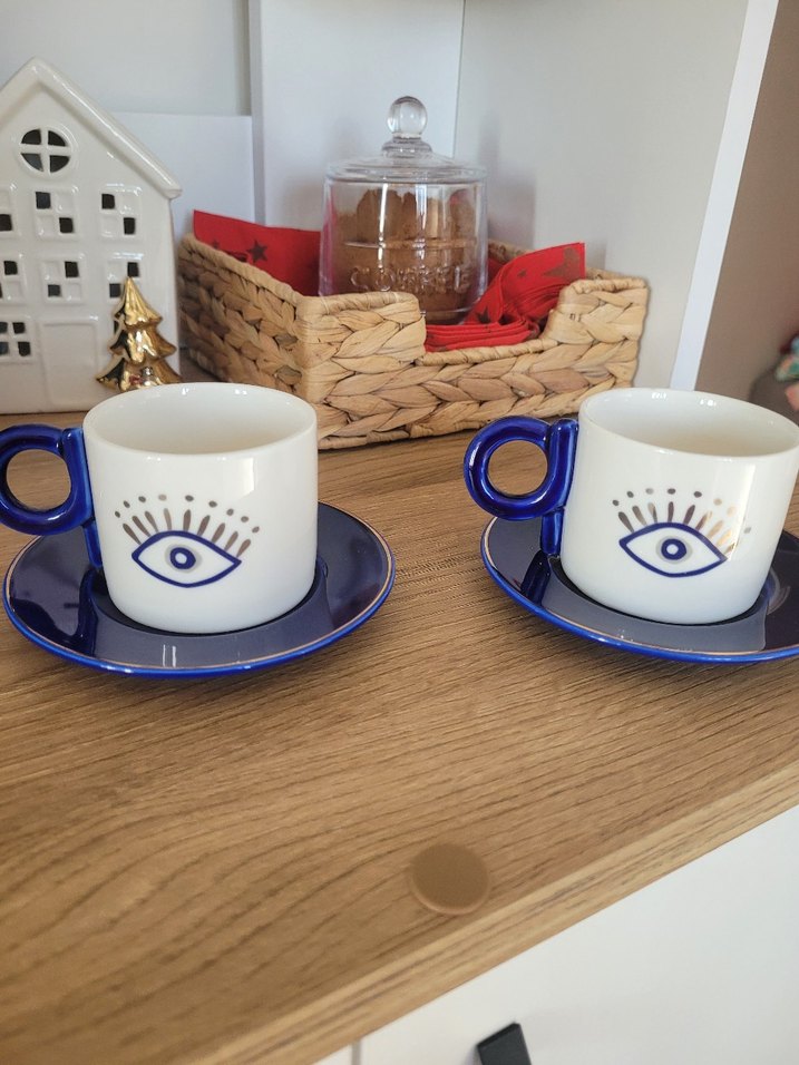 İki adet mavi kulplu kahve fincanı ve tabaklardan oluşan set, her fincanda göz deseni bulunuyor. ☕