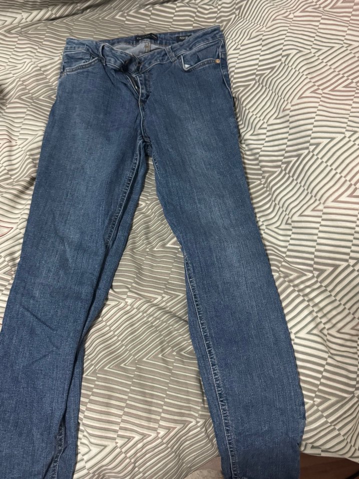 Mavi kumaştan, kemer detaylı, normal midi boy, dar kesim kadın kot pantolon, günlük rahat kullanıma uygun.
