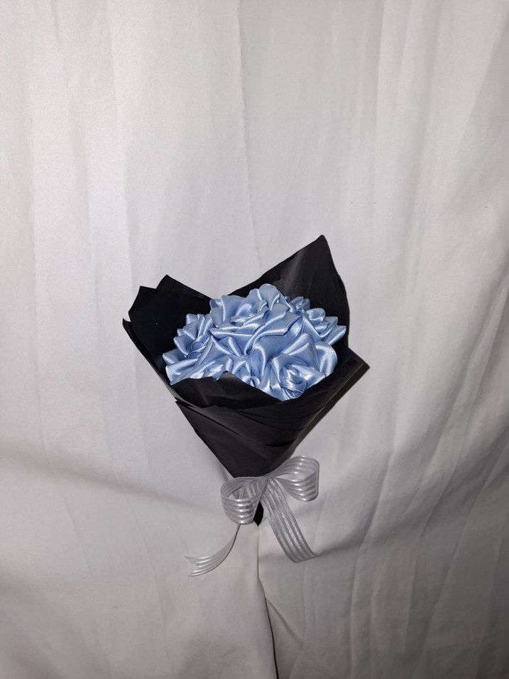 Siyah buket kağıdına sarılmış mavi kurdele çiçek buketi. Sevdikleriniz için solmayacak bir buket. Sipariş alınır.