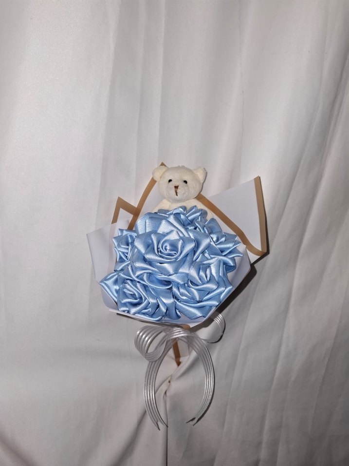 Beyaz buket kağıdına sarılmış ayıcıklı, mavi kurdele çiçek buketi. Sevdikleriniz için solmayacak bir buket. Sipariş alınır.