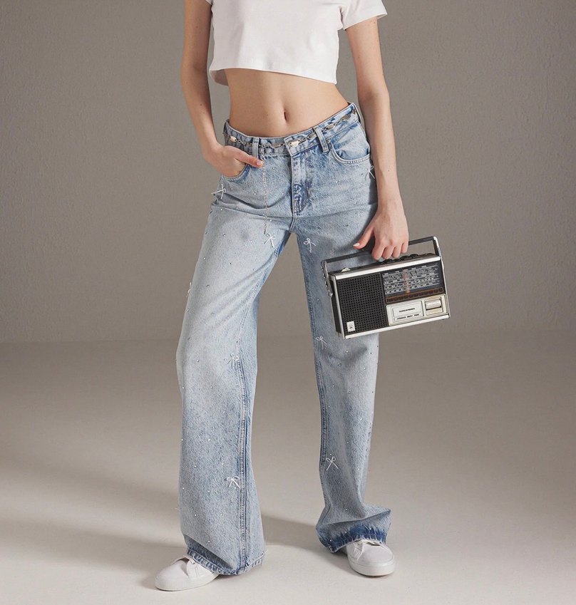 Pastel mavi kurdele desenli, rahat kesim denim pantolon, gündelik kullanım için rahat ve şık bir sokak stili sunar.