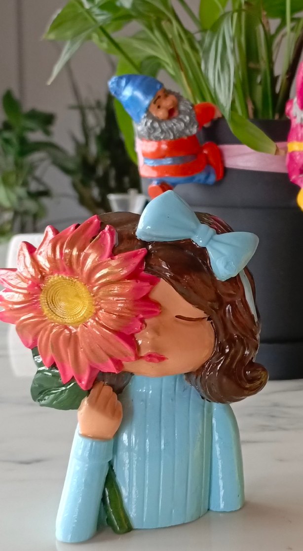Mavi kurdeleli kız figür, büyük pembe ayçiçeği tutuyor, detaylı saçlar ve sakin ifade ile .