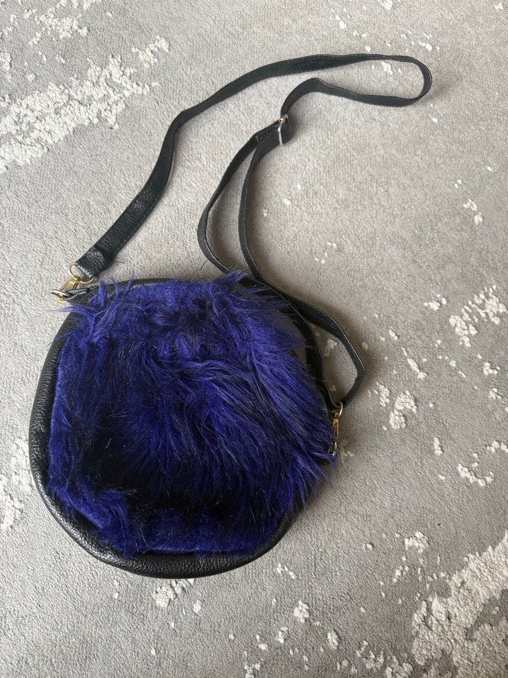 Kadın çantası, koyu mavi kürk detayları ile rahat bir görünüm sunar. Bağcıklı desenle bohem ve retro tarzda, günlük kullanıma uygundur.