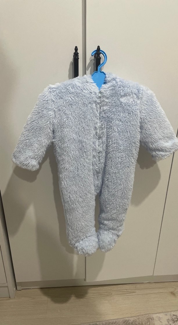 Mavi renkte, yumuşak ve sıcak kumaştan yapılmış, kürk detaylı bebek tulumu. Desensiz ve normcore tarzında tasarlanmıştır. ❄️