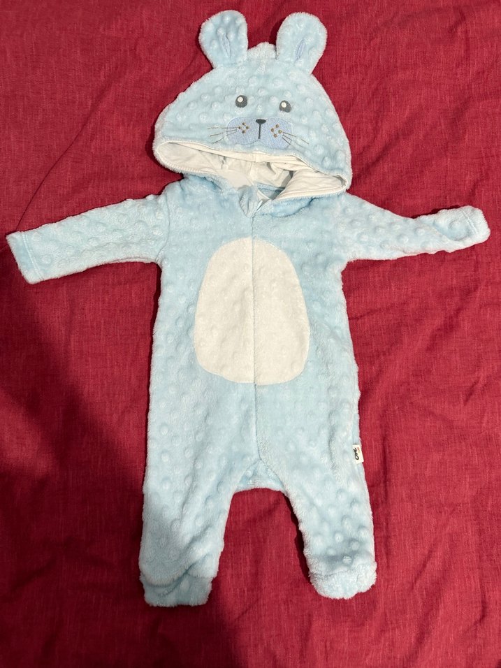 Yumuşak ve sıcak kumaştan, kürk detaylı, kulaklı kapüşonlu mavi bebek tulumu. Desensiz ve rahat bir modeldir.