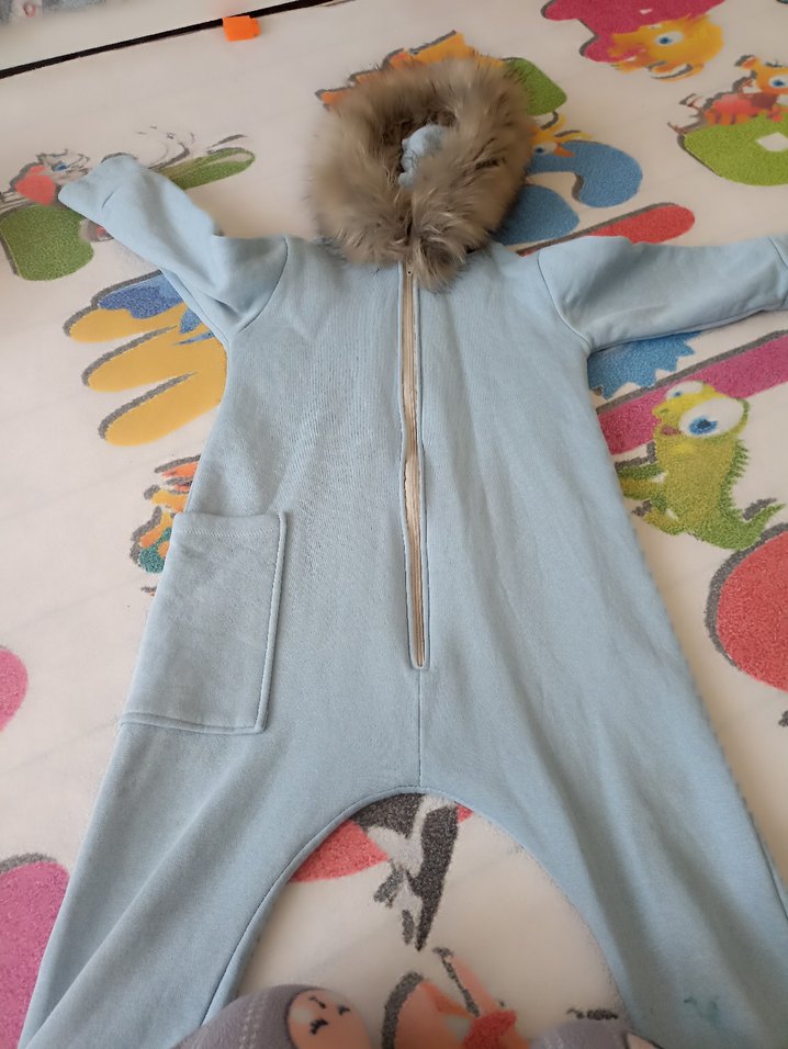 Mavi renkte, gri kürklü kapüşonlu ve ön fermuarlı bebek tulumu. Yanında cep bulunur, normcore tarzında. ❄️