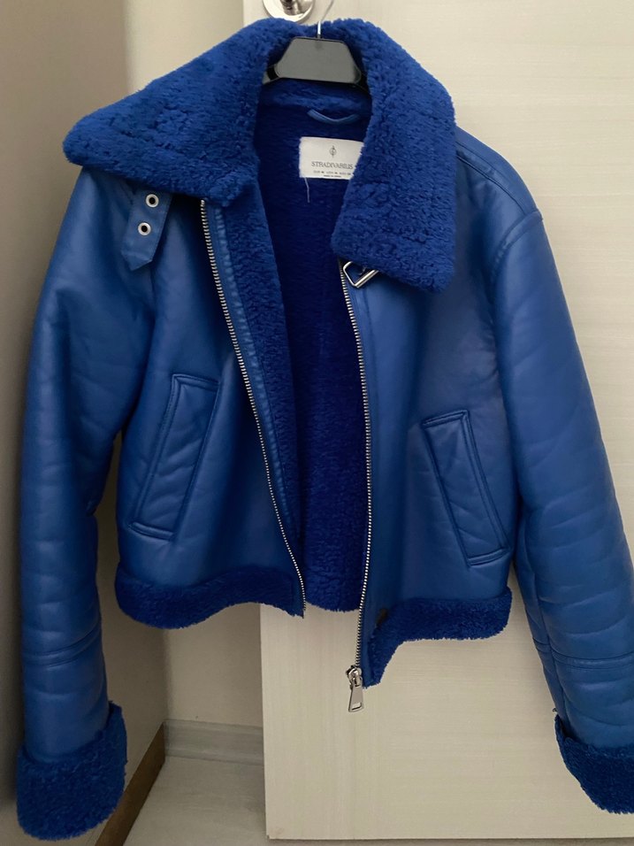 Mavi deri ceket, kürk detaylı yakası ve manşetleriyle, strappy kollu ve midi boyda, şık ve günlük kullanıma uygun bir sokak stili sunar.