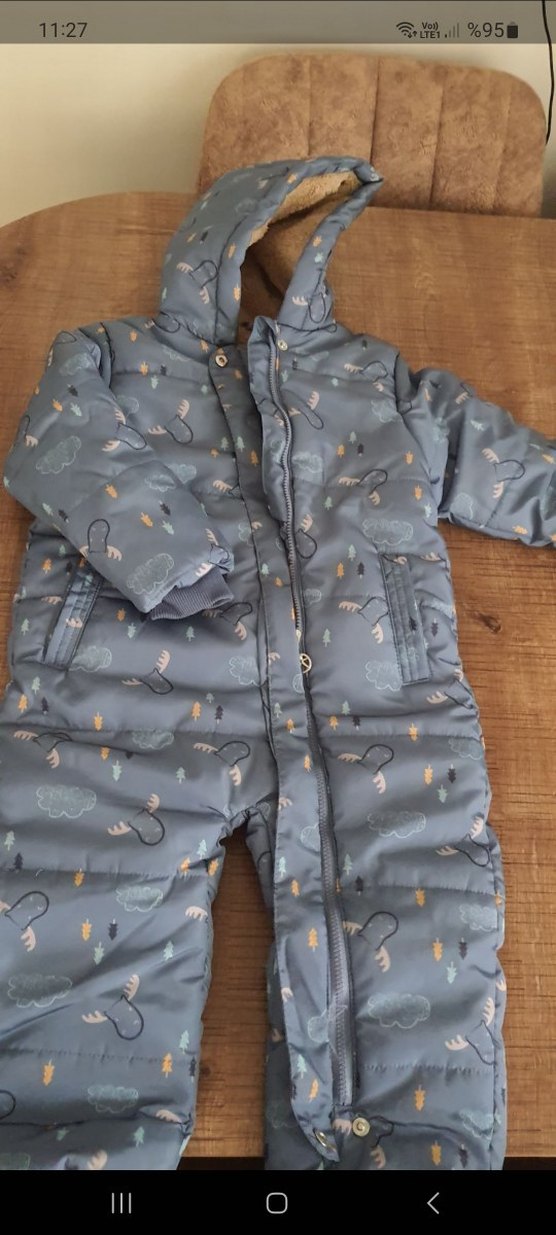 mavi renkli, baskılı desenli erkek bebek kayak tulumu, yumuşak ve sıcak kumaş, kapüşonda kürk detaylı. Soğuk hava için uygun. ❄️
