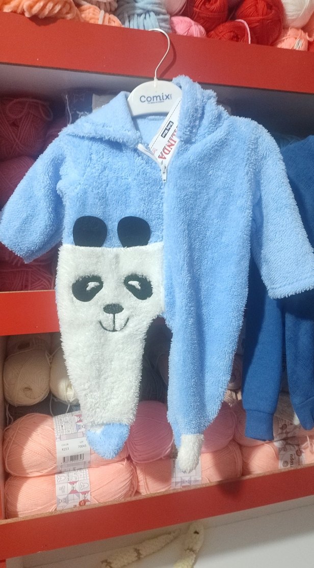 Yumuşak ve sıcak kumaştan, renkli baskılı ve kürklü detaylı erkek bebek tulumu. Önü fermuarlı, panda desenli, sokak stili.