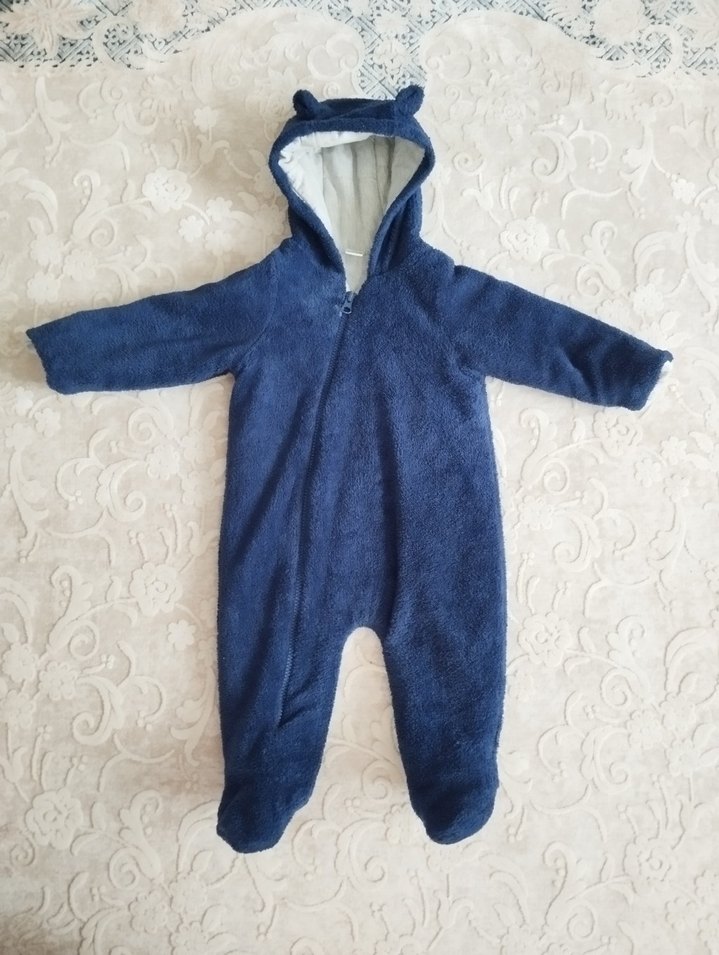 Yumuşak ve sıcak kumaştan, kürk detaylı mavi erkek bebek tulumu. Kapüşonunda küçük kulaklar ve önde fermuar bulunur. Soğuk havalar için uygundur. ❄️