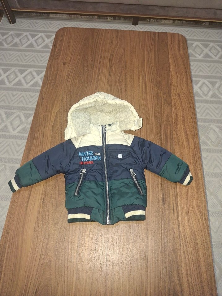 Koyu mavi renkli, baskılı ve kürklü kapüşonlu, notched lapel yakalı, fitted kesim erkek çocuk montu. Yumuşak ve sıcak kumaş kullanılmış.
